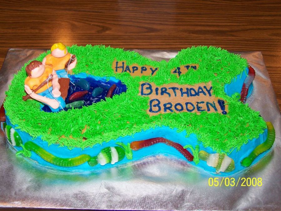 This cake was made using the ribbon pan, covered with buttercream. The people are fondant, water is colored piping gel. My 4 year old nephew wanted a fishing cake, his 1 year old brother also got a fish cake as their birthday parties were together.