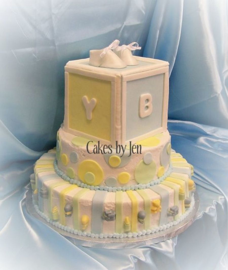 Buttercream icing with fondant box and circles. My first time making a box and booties. Candy melts decorations on the sides. I had a lot of fun making this cake. Thanks for looking!