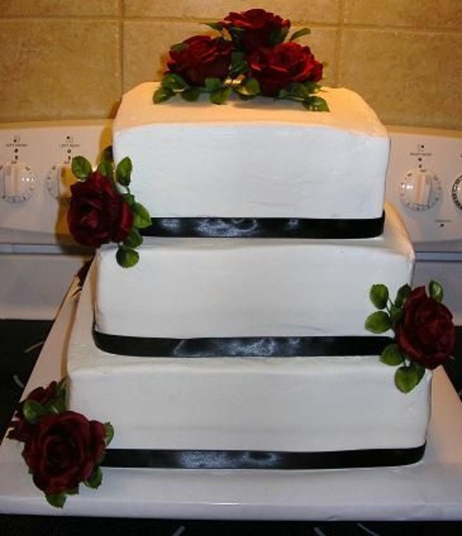 12", 10", 8" squares. Buttercream icing w/black ribbon trim & silk red roses. Ribbon & Roses selected by the bride.