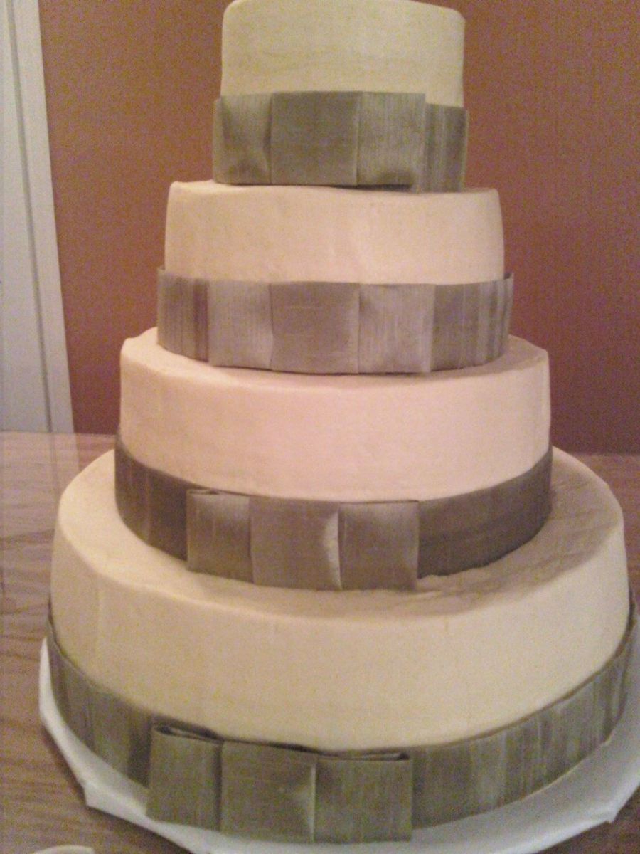 This cake was a nightmare. My husband was "in a hurry" during set up and he did not measure the support sticks and the back sank in. I got a call later and went and propped up the back. Bride wanted simple with ribbon.