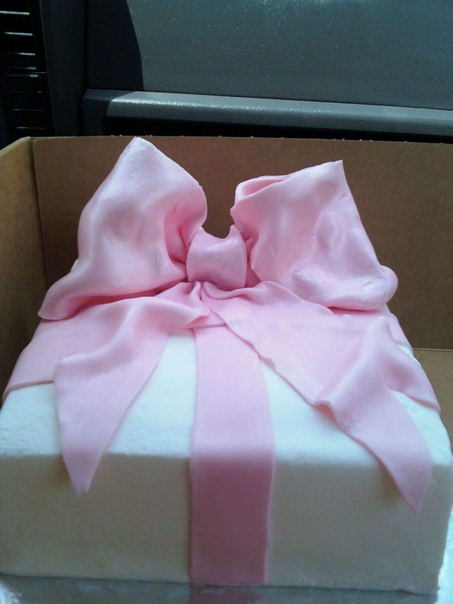 Pink fondant bow. White cake, BC icing