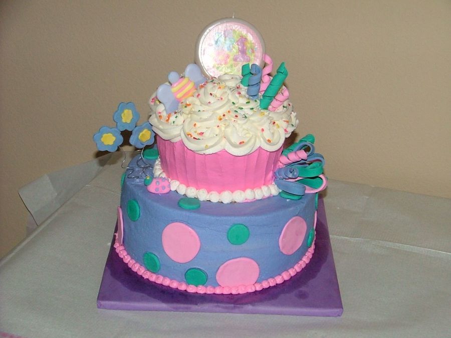 Cupcake cake made for first birthday. It fell before party and this is the repaired picture. Crusting buttercream with fondant and royal icing accents.