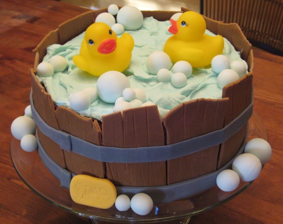 This cake was so fun to make. It's an 8 in. vanilla cake covered and filled with chocolate buttercream icing. The slats, or boards, were made of fondant, as well as, the bubbles. The water on the cake was iced with blue buttercream icing. The only things that were not edible on the cake were the rubber duckies. I was looking for ideas for baby shower cakes and found numerous rubber duckies in a tub on this site. Thanks to eor112 for the inspiration!!