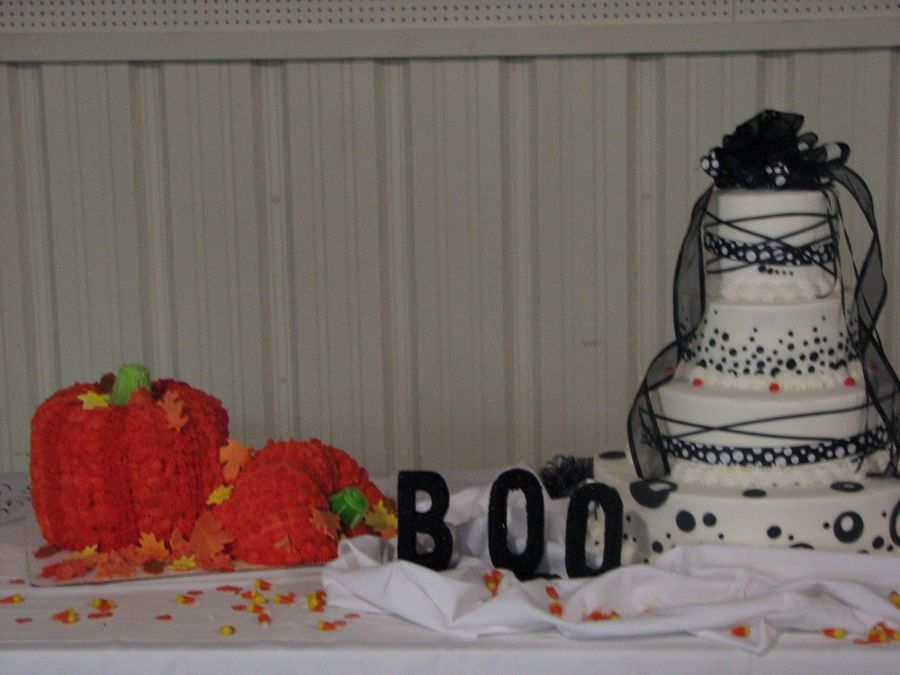 After almost 20 years I finially got to do a halloween wedding with a pumkin grooms cake. The hall was decorated really nice and it made for an elegant theme wedding. All butter cream with some fondant circles and leaves and ribbon accents. Thanks