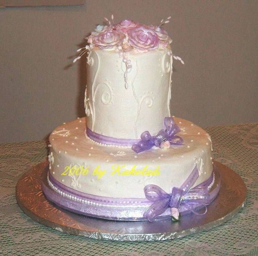 10x3 round base cake with 6"x6" rounds (three 2" layers) on top. Iced in buttercream; real ribbon; gumpaste roses. Placed on 16" & 12" round cake drums. This design was suggested by something I saw in "Wedding cakes: A design source" magazine from England.