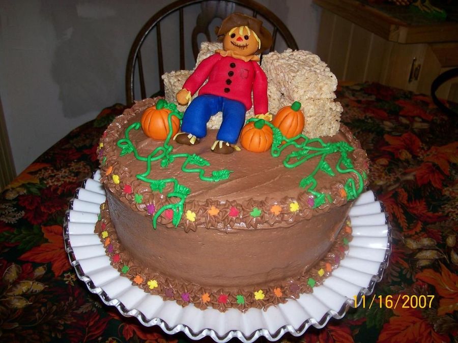 Chocolate cake with chocolate bc. Rice krispies hay bales and first time fondant figure and pumpkins. Idea from this site, of course. Thanks to all for sharing ideas and know-how.