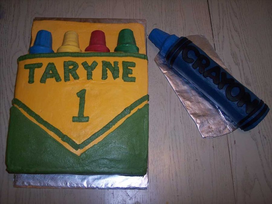 I made this cake for my crayon-eatin'-one-year old! It was inspired by several cakes off this site and was a fun cake to make. It is chocolate cake with cream cheese icing. The crayon tips are icecream cones dipped it candy melts. TFL