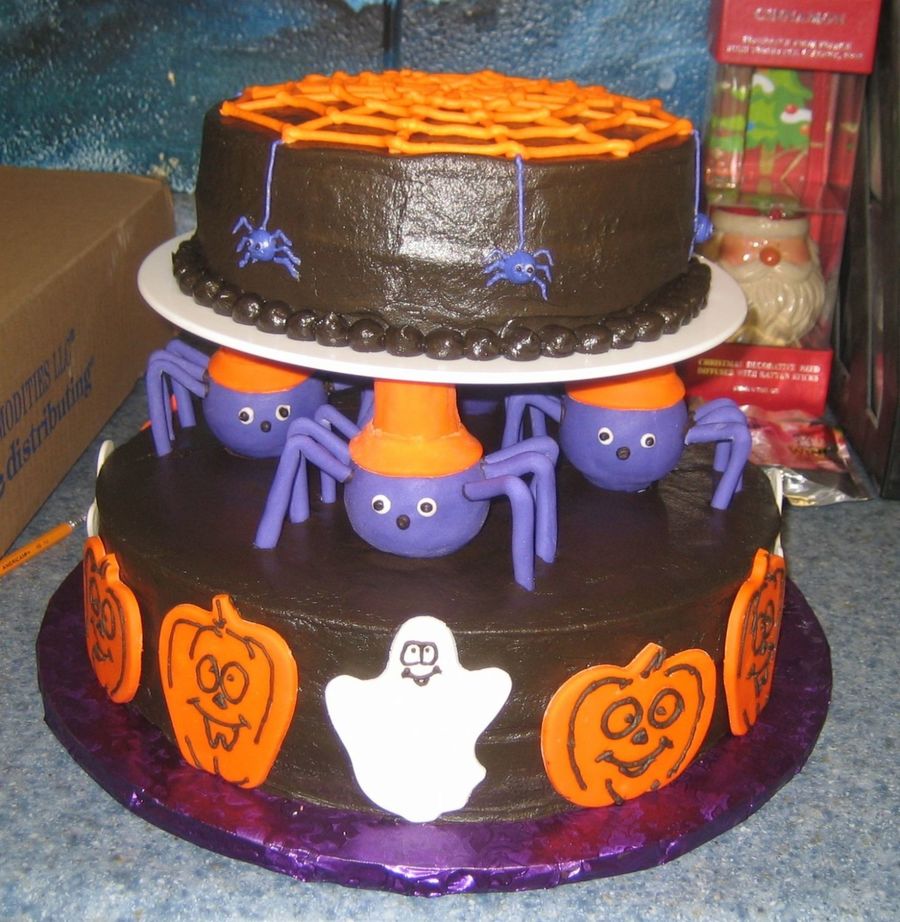This is a different version of the Halloween cake in the Wilton Yearbook 2009. We left the pumpkin off and put the spider web. This is bc icing with fondant decorations.
