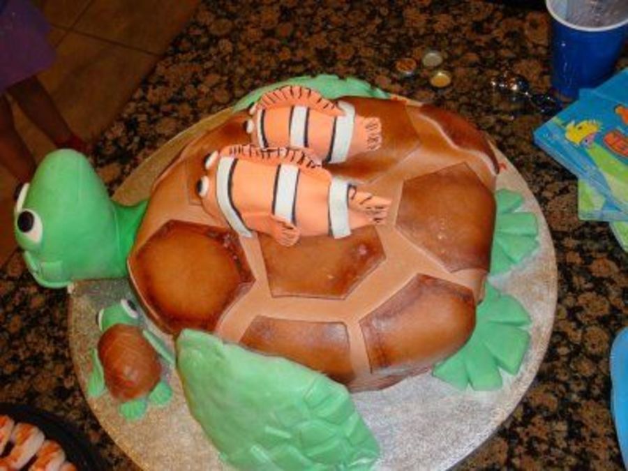 Butter cake w/ buttercream filling. Covered/decorated w/ mmf. Crush's head, fins(flippers?), Marlin, Nemo and Squirt are all RKTs.