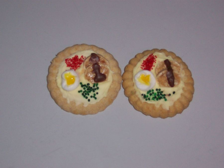 I did these about 2 years ago for a friends daughters preschool snack. The turkey is a caramel candy cut length wise and the "gravy" is melted chocolate. The cranberries and peas are non perils and the mashed potatoes are butter cream frosting and the "melted butter" is yellow food gels. All placed on top of a frostedvcookie.