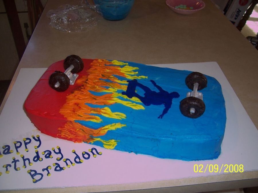 This cake was made for a boy that loves skateboarding. It is buttercream icing with fondant struts and wheels.