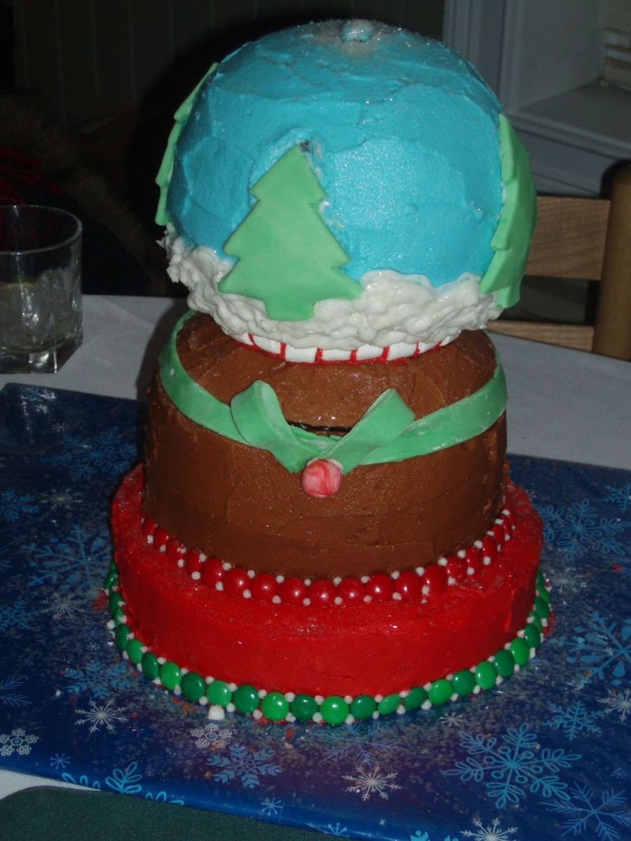 My first attempt at a snow globe. I used the round ball pan for the top and fondant for the trees and bow.