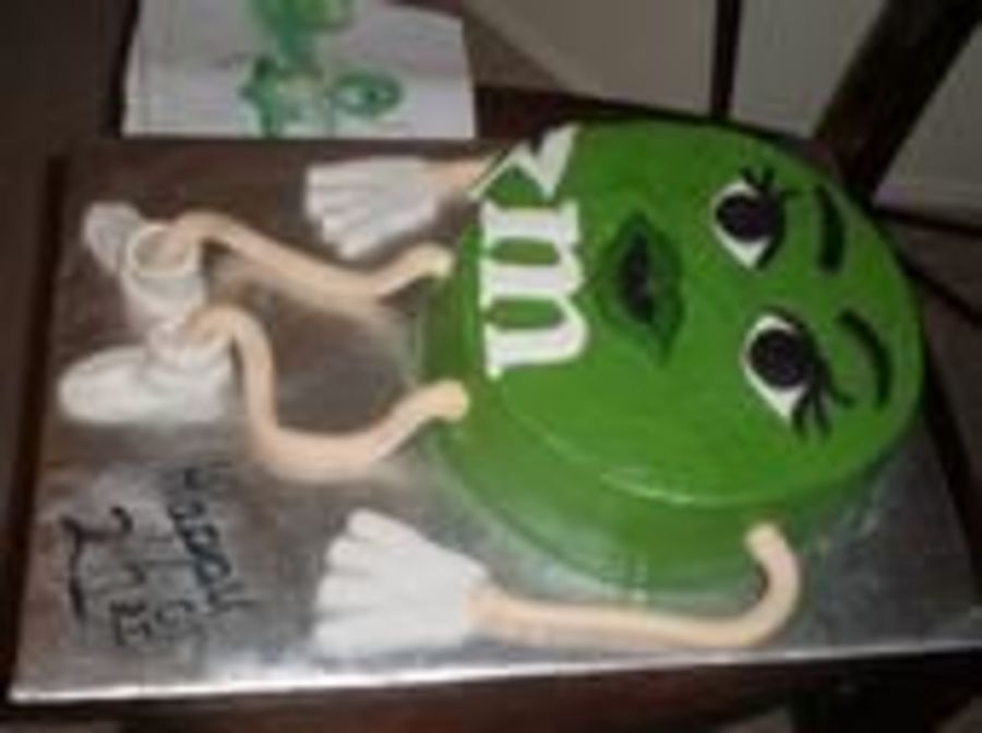 I used a 10" cake and covered it in BC. The arms,legs, eyes, eye brows, and the "m" are made of fondant.. On the side I put a little banner that read: "Melts in your mouth, not in your hand". This was really fun to make.