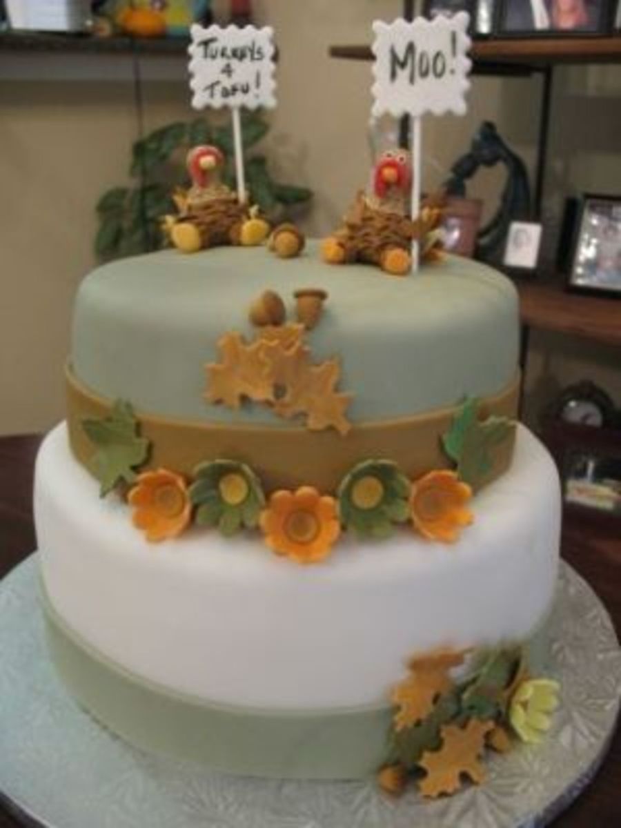 This was a cake I donated to the Ronald McDonald Gatewood House - a chocolate bottom layer and red velvet top layer, iced with buttercream, covered in fondant. The decorations are fondant. I am pleased wih how the turkeys came out.