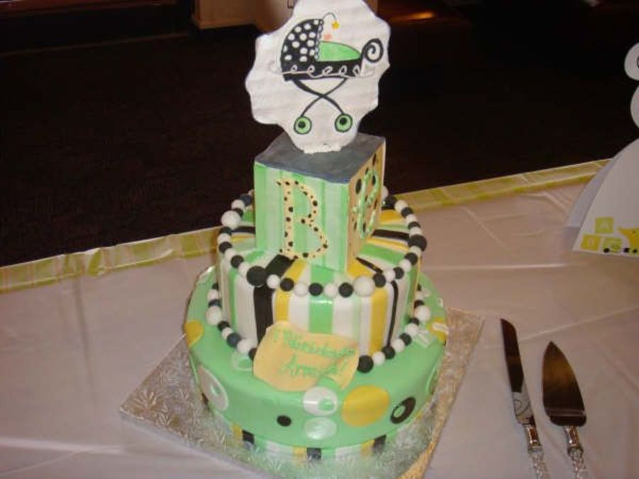 This cake was for a baby shower themed: "Stroller Fun". I loved it because it wasn't done in the typical "baby shower" colors. The cake is a french vanilla with vanilla buttercream, covered in fondant. The block and stroller plaque were both done in gumpaste. Thanks for looking