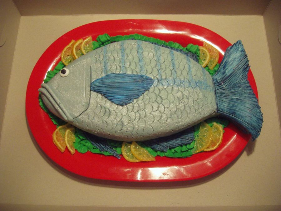 This is the fish cake from Colleen Peters book. It's all buttercream except for the fins. The lemons are real lemons that I candied. She had it in the easy section of her book, but I found it quite challenging! ha ha