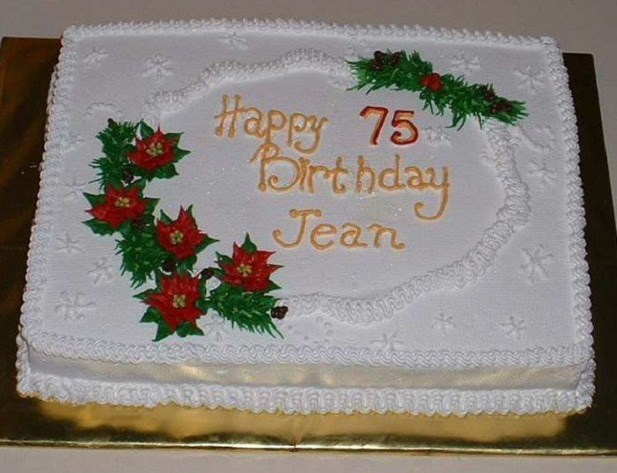 For a birthday near Christmas this 11x15x2 sheet is completely iced & decorated with b'cream. Pine boughs are piped with tip 233. Poinsettias are made right on the cake with tip 350. Tip 18 makes the zigzag borders.