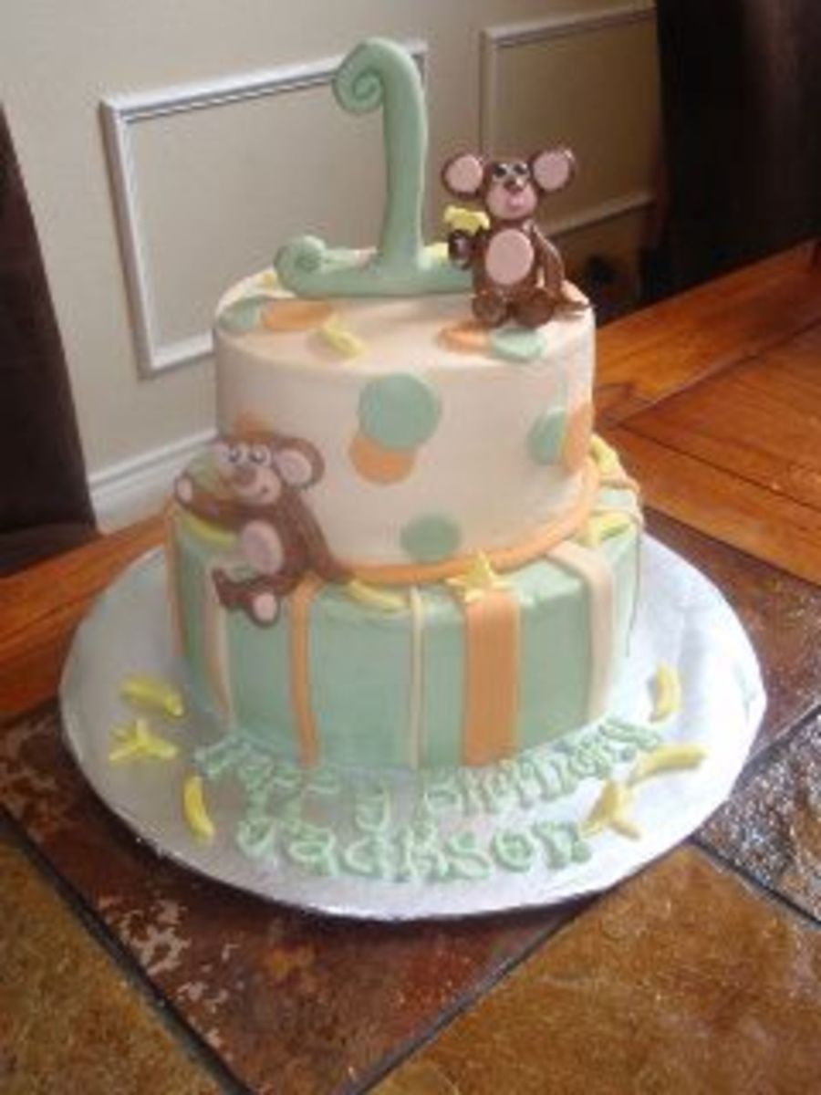 Buttercream base, fondant decorations, and gum paste monkeys and bananas.