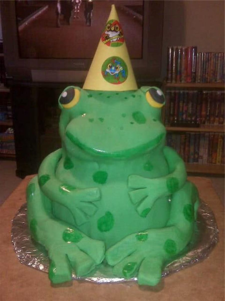 3D frog made out of one 8" round pan, 1 pyrex bowl and a sculpted 6" pan. Covered in fondant. Painted the spots in food coloring. The only inedible part is the party hat (made out of construction paper)