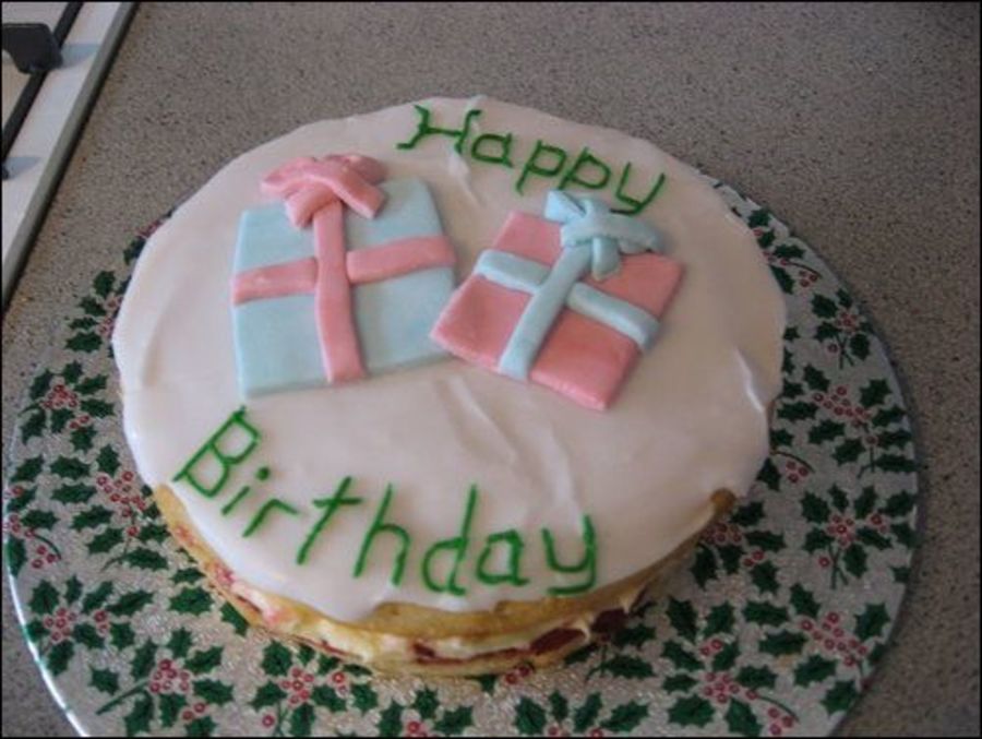 plain sponge, iced, with fondant gifts.