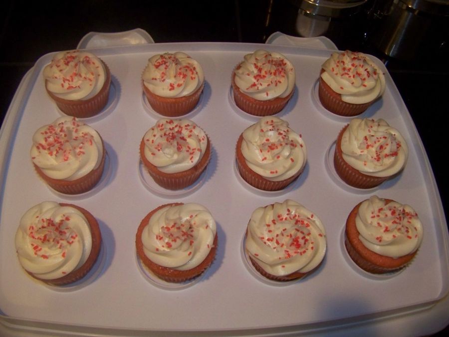 These are strawberry cupcakes with cream cheese icing. They are also filled with cream cheese peppermint filling. The sprinkles are peppermint sprinkles.
