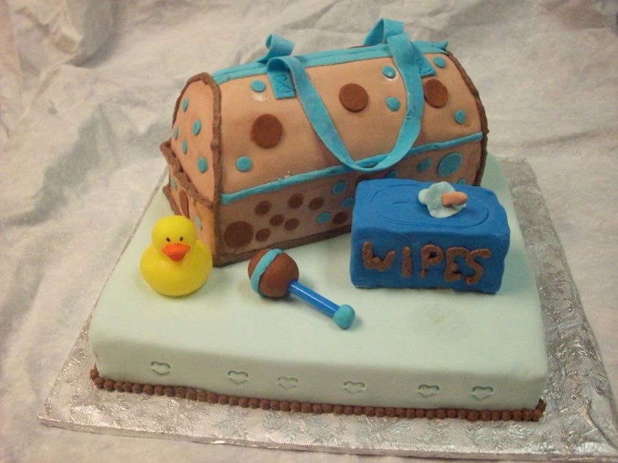 This was my first diaper bag. It's for the sister-in-law of a gal my husband works with. The base and diaper bag are covered in fondant. The wipe box is cake.