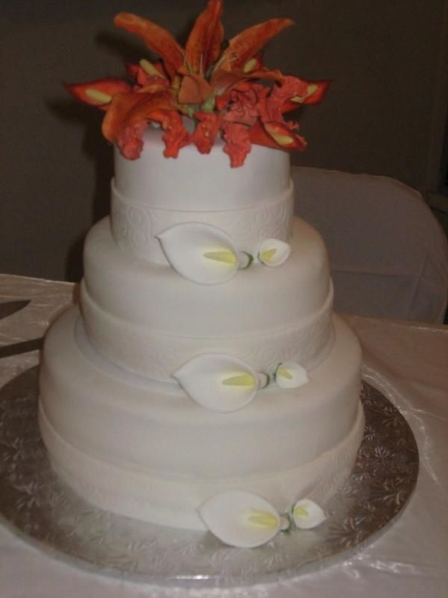 Believe it or not this is my first wedding cake. It is a rum soaked vanilla cake, with rum butter creme. I made the Calla Lillies and the bride place the stargazers a top the cake. What do you think?