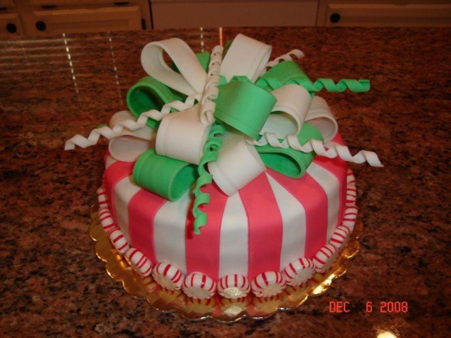 Made to look like a peppermint candy, this was for a Christmas Party I went to this weekend. All fondant details with peppermint candies for border. It was a big hit--most people thought it was a decoration rather than a real cake.