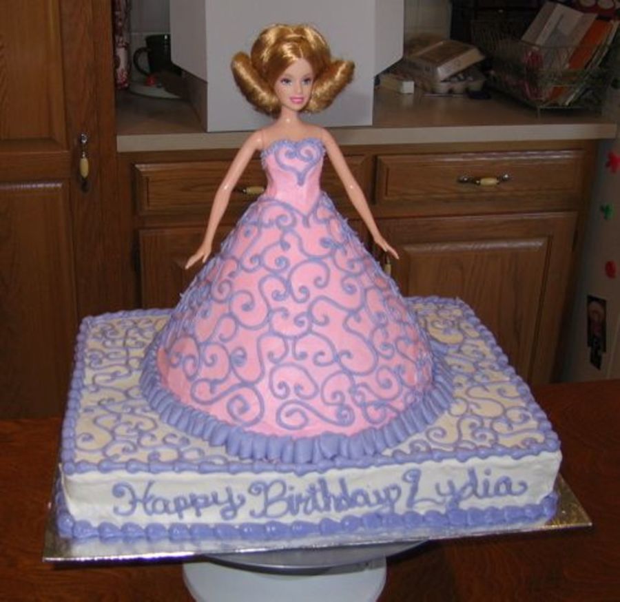 Doll cake on a 1/4 sheet base. I usually have a hard time designing dresses in buttercream for doll cakes...but was pleased with all the swirls on this one! TFL