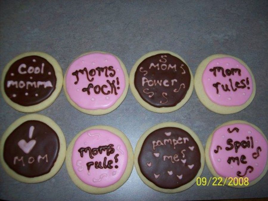 For a mom's group, the ever popular pink and brown. Round Sugar cookies w/ phrases like mom's rock, mom power, etc .