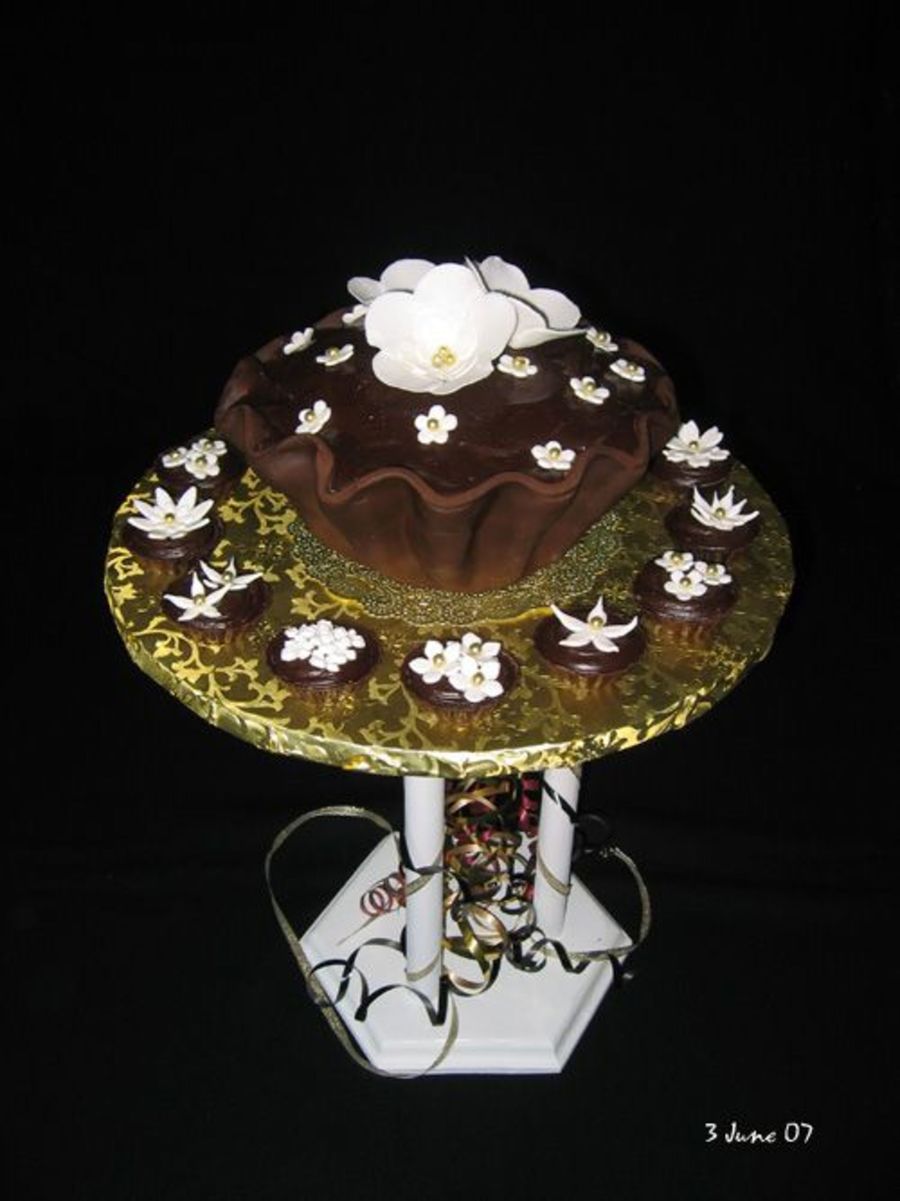 "Truffles" were chocolate ganache in chocolate shells with gumpaste decorations-- Cake was Grand Marnier chocolate chip cake with chocolate meringue buttercream, chocolate fondant, and poured ganache top decorated to match the "truffles."