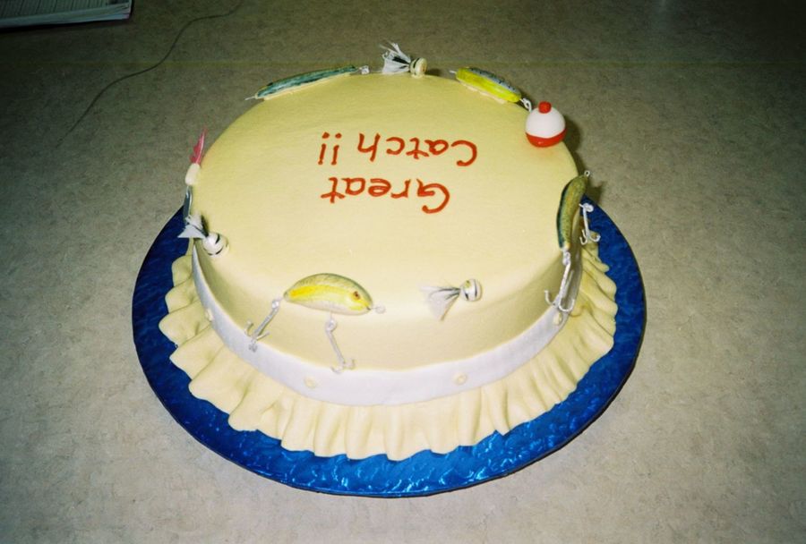 This was a fishing hat made for an avid fisherman. The lures were hand-molded and painted out of fondant.
