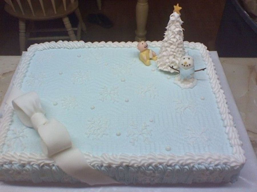 This cake was done for a baby shower with a snowflake theme.. the tree is done with a plastic cone mold with royal icing. The baby, snowman and bow are fodant.. The rest is buttercream. I used edible flakes all over.