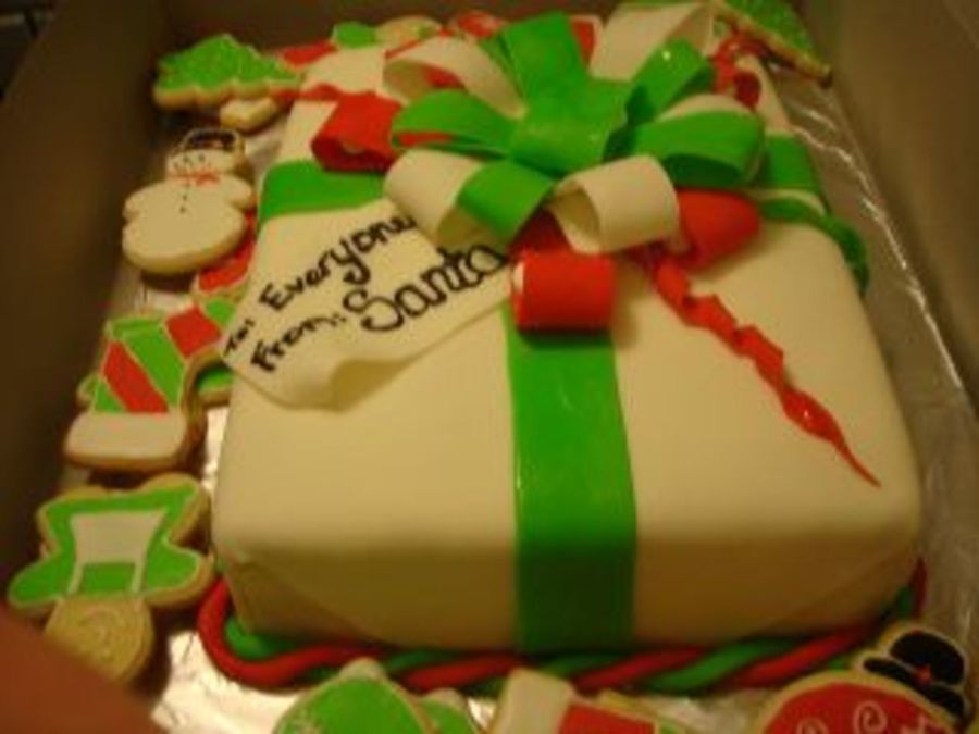 This was for a family Christmas party. I did not allow the bow long enough to dry...so it kinda died. In the picture there are marshmallows to hold it up a little. They still loved it. All MMF and cake was devil's food and almond buttercream. Also, it was in the box before I remembered to take the picture...so this is it and the 2 dozen cookies and were purchased with it.