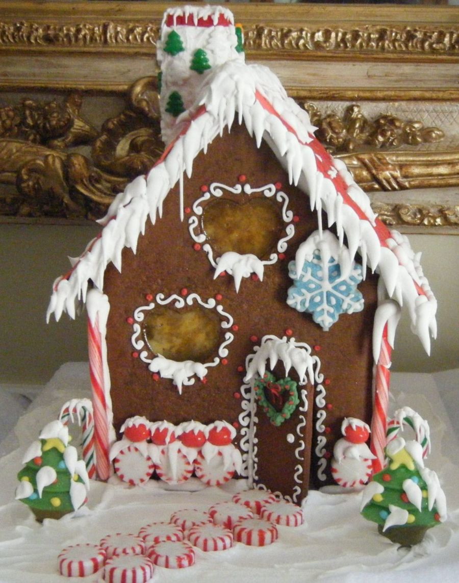 Red fondant roof (airbrushed with more red); heart-shaped candy "glass" windows. It lights up, but I didn't have it plugged in for the picture.