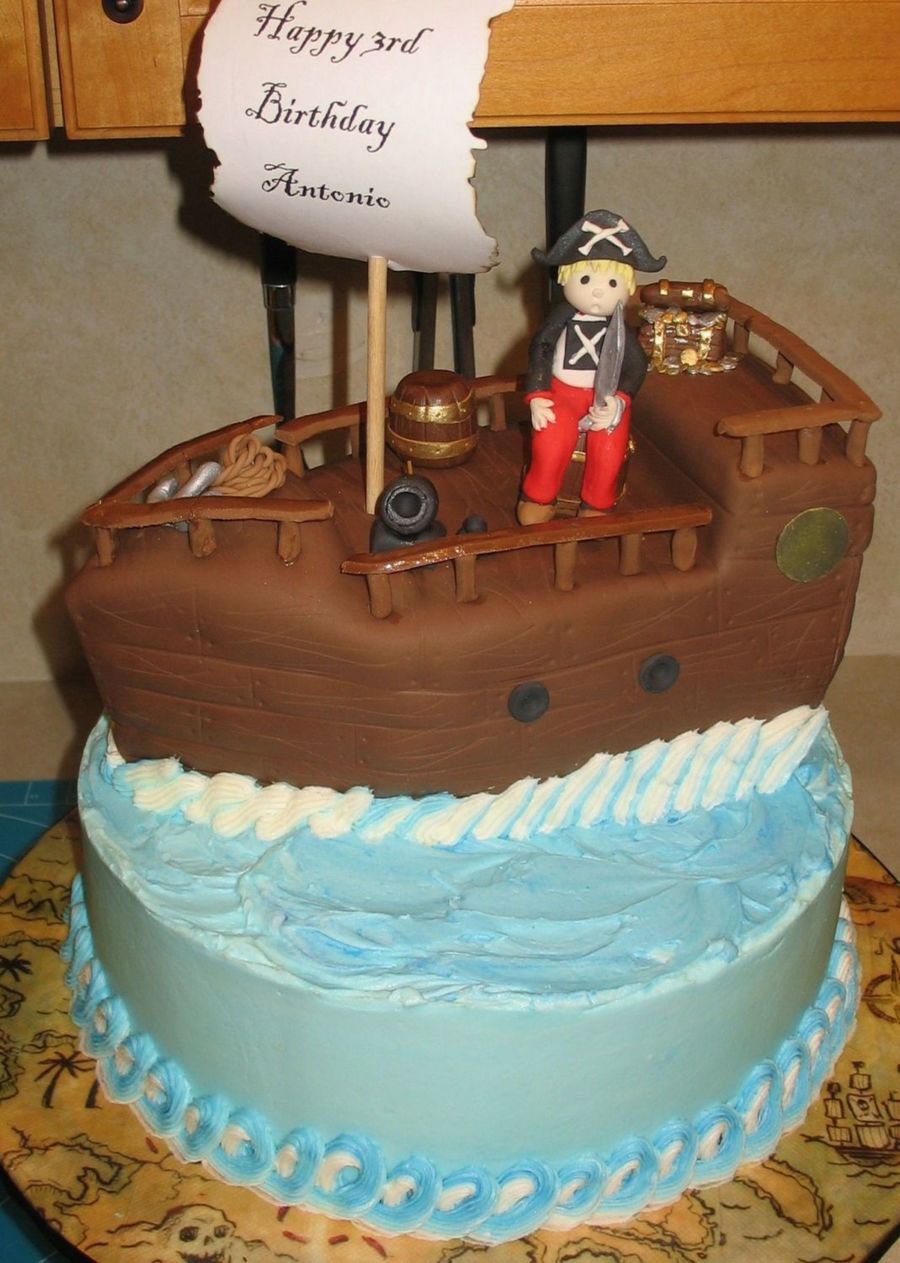 Cake board is covered with a pirate placemat I found. 12" round is BC. Pirate ship is a 6" square with a rice krispie treat bow, then covered in fondant. Boy is gumpaste & modeled after the pirate in Debbie Brown book. Treasure chest, ropes, barrel & canon are all GP. Mast is a dowel & sail is plain paper.