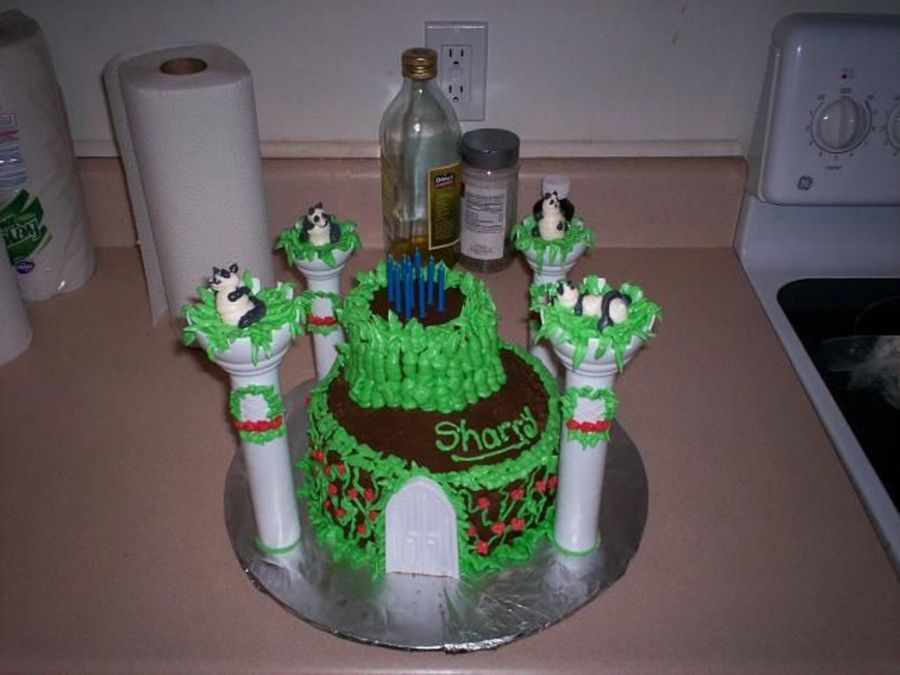 My youngest daughter is Panda crazy and my oldest daughter is the real cake decorator but some cakes we work together. I got to help with this one because about all I can do is pipe animals. I think this one came out rather cute.