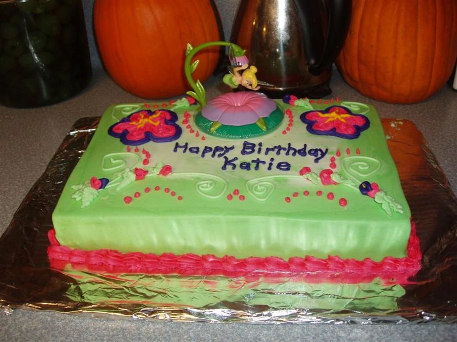 White cake with BC icing. Tinker Bell cake topper in the middle.