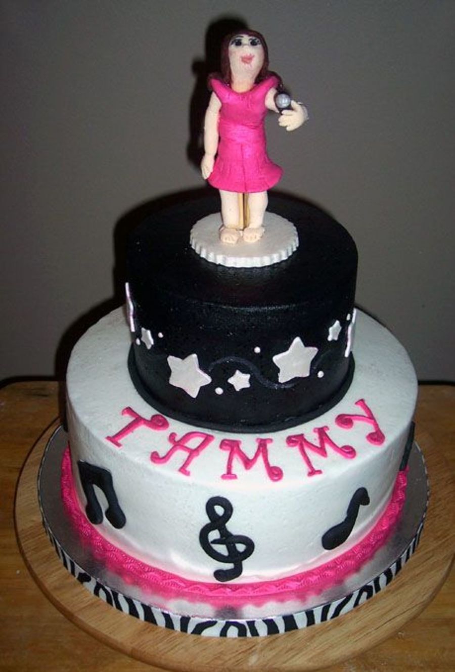 Very disappointed with this one. Mixed fondant and gumpaste for the figure but it kept cracking and wrinkling for some reason. Also, when I woke up the next morning the white stars had traces of pink from the black icing bleeding through. Borrowed design.