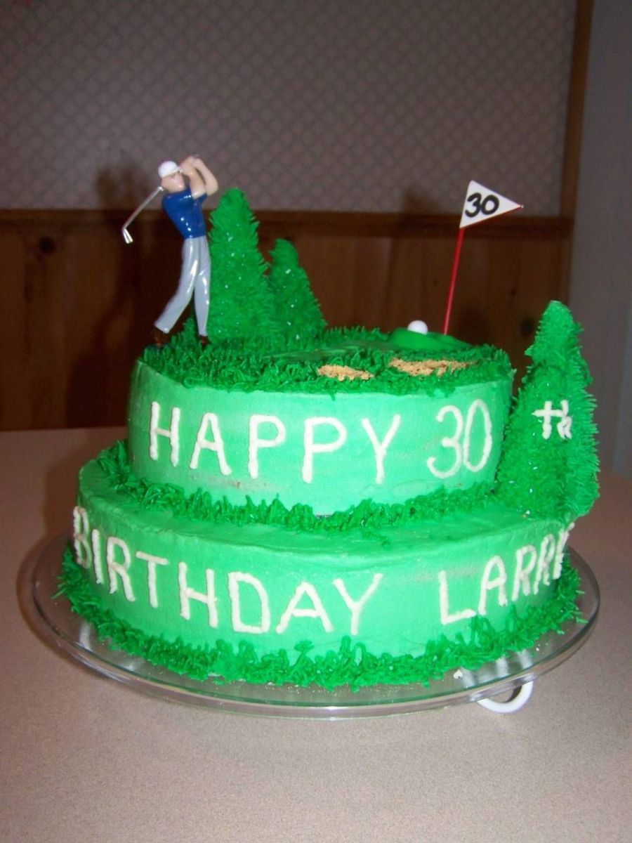 Chocolate and white cake iced with buttercream, decorated with plastic little golfer and golf balls