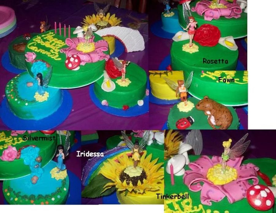 Cake for my niece's 4th birthday. She's a Tinkerbell fanatic. 4 6inch rounds with a 10 inch round on top. Chocolate and Funfetti. All Buttercream with Fondant and Royal decorations. The Sunflower is silk.