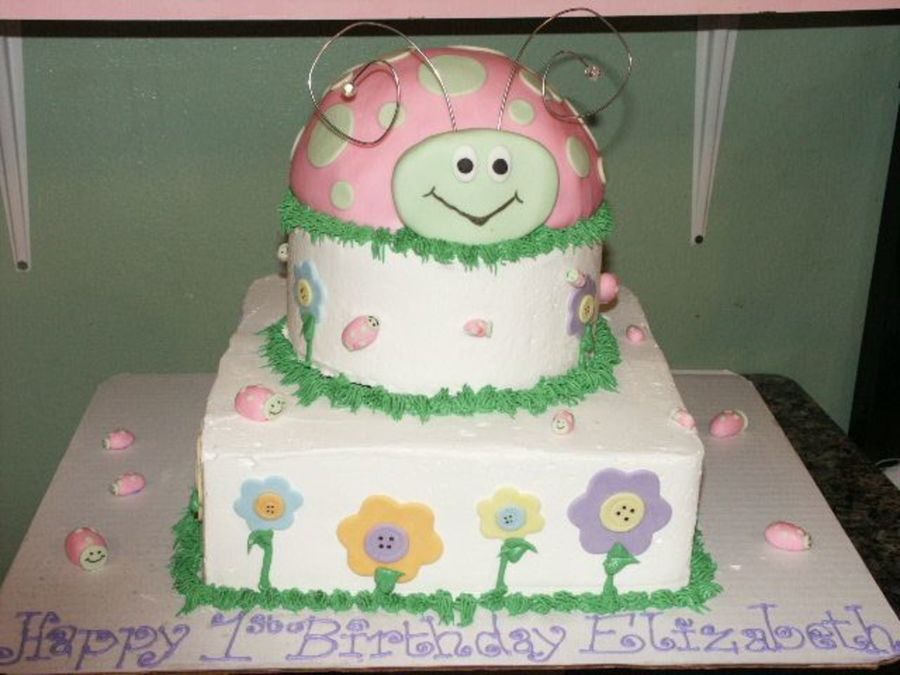 10" square bottom, 7" middle with 7" and 6" for lady bug top smash cake-hand carved to make round, BC and fondant work