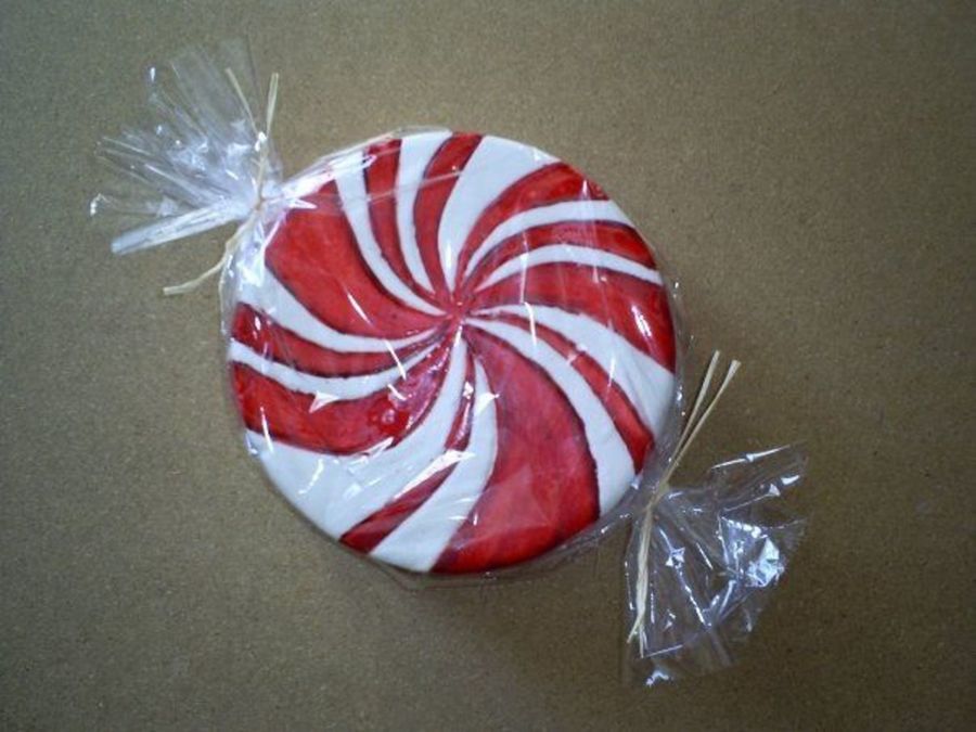 8" round covered in MMF. The stripes are painted w/ red food color. I wrapped it in cellophane to look more like a candy. (Plus the food color looked "dirty" in some spots, so that helped diffuse it.)