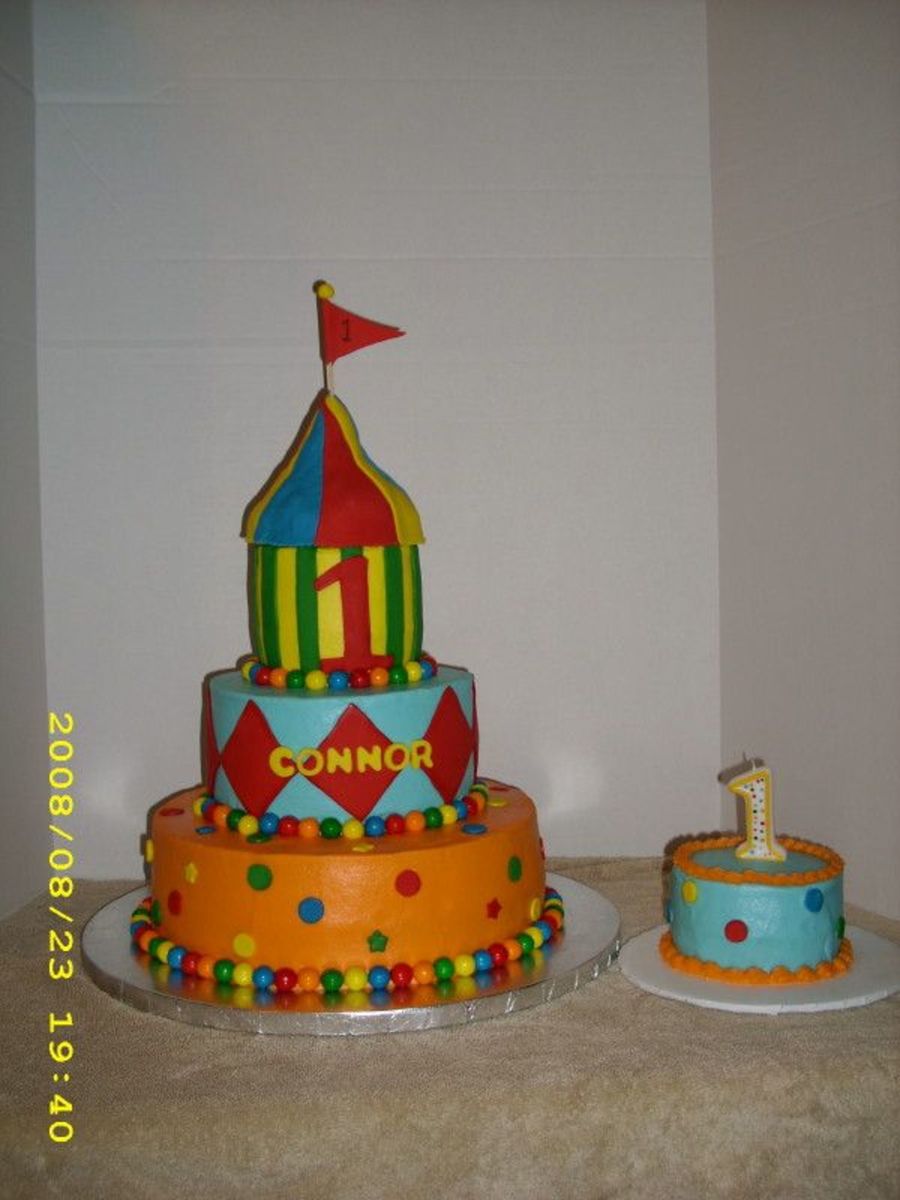 Made for a little boy's first birthday. Mom was doing a circus theme. Top of "tent" was made out of rice crispie treats and covered with fondant. Border is all gumballs. All buttercream with fondant decorations.