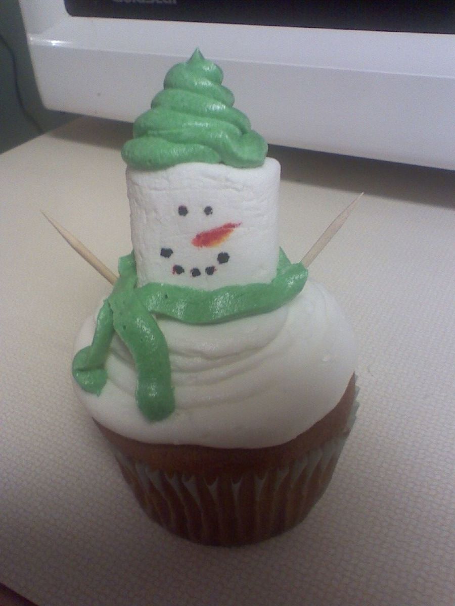 snowman marshmallow cupcake with buttercream scarf and hat