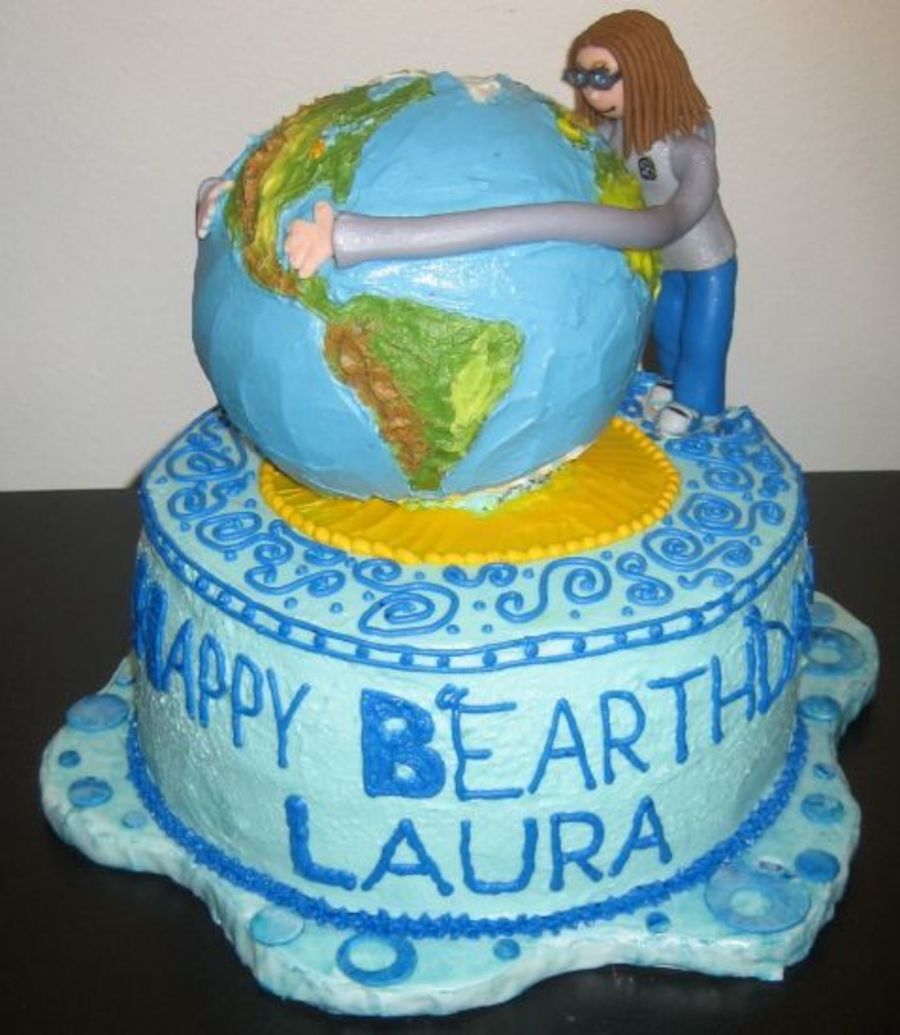 The girl's long arms are giving the earth a massive hug in this b"earth"day cake. The earth is created from the Wilton sport ball pans and the girl from fondant. I also covered the cake board in fondant.