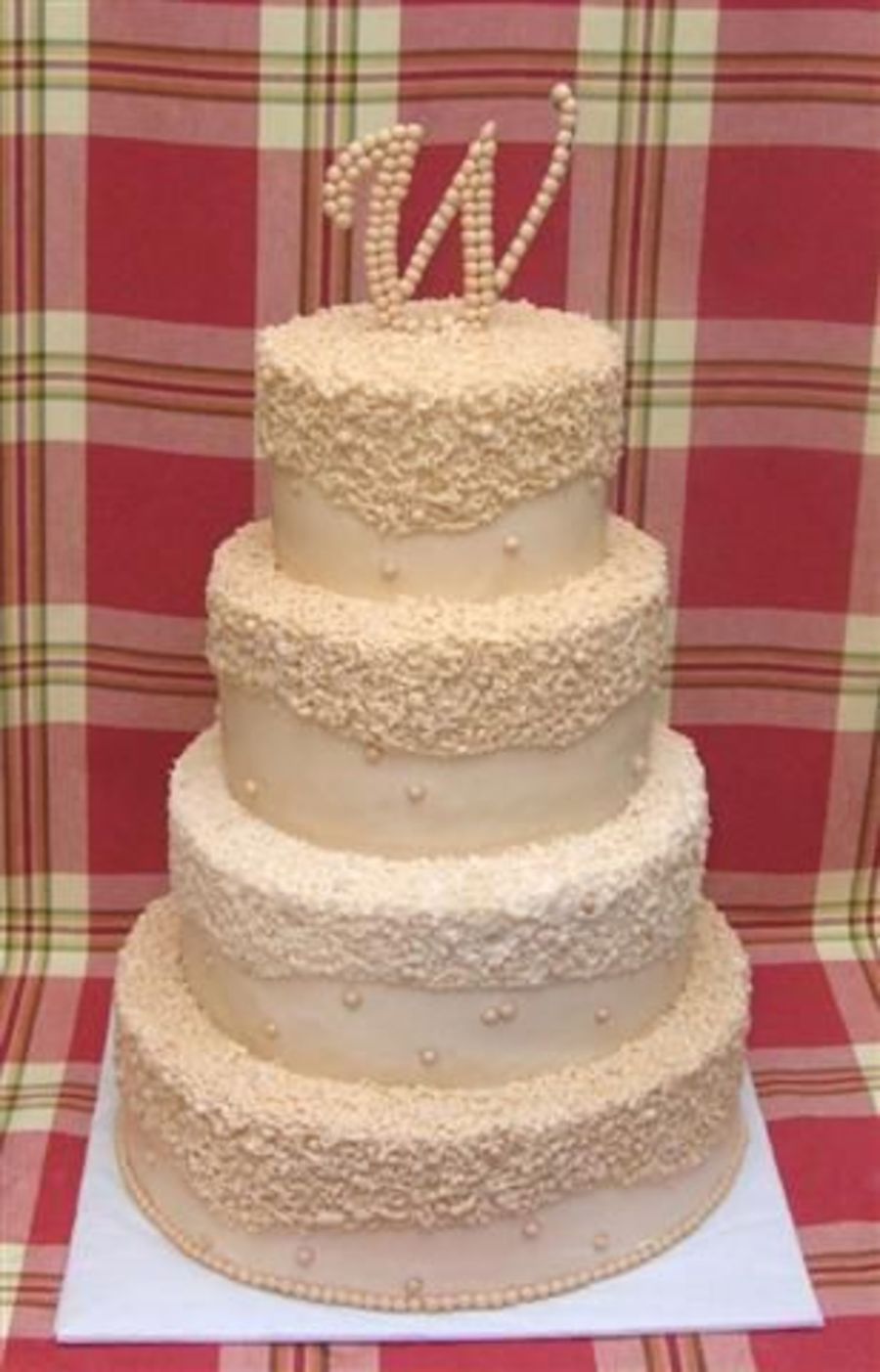 6in, 8 in, 10 in, and 12 inch cakes. Buttercream icing with buttercream detail. Then made small pearls out of fondant. Bride had W topper but didn't like the finish so we added fondant pearls. Bride sent me a picture so I'm not sure who made the design. It is a great design. Thanks if you are on here! :) TFL
