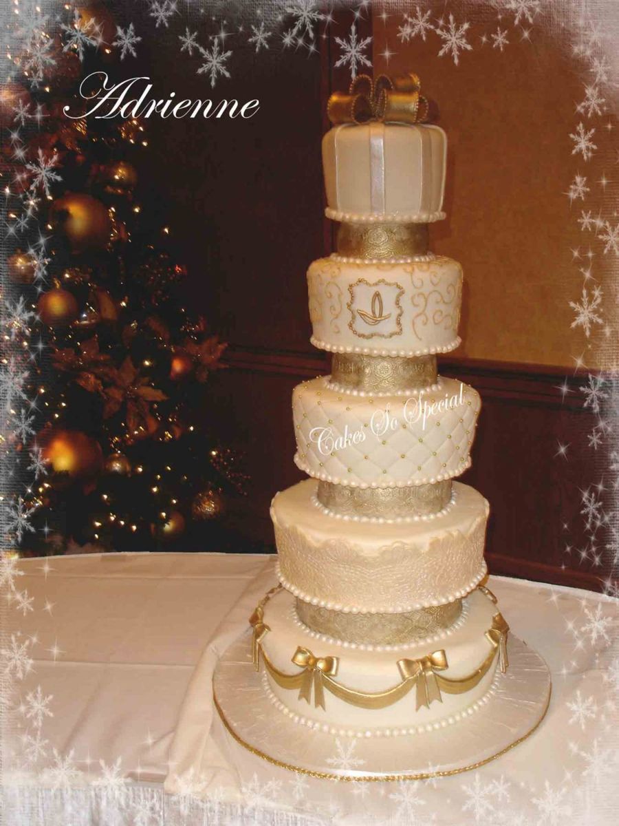 9 tiers of cake. The single layers are chocolate and the regular tiers are French Vanilla with creamcheese and strawberry fillings and a bavarian cream filling. The large tiers are 6, 8, 10, 12 and 14" cakes and the single layers ar 4, 5, 7, and 9". Gold highlighter on the bows and a pearl edged bow on top. Thanks for looking.