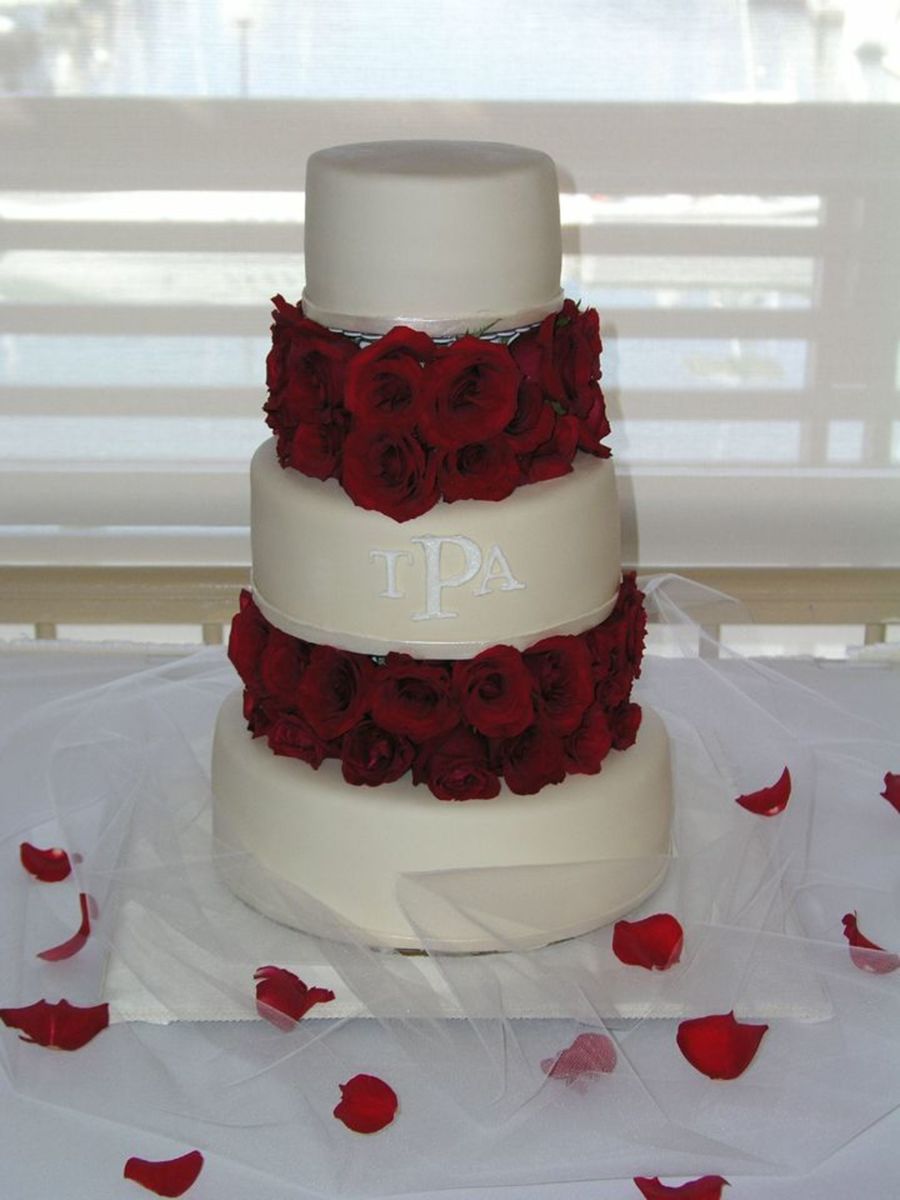 WASC with strawberry and blueberry filling, covered in MMF with royal icing monogram and fresh roses