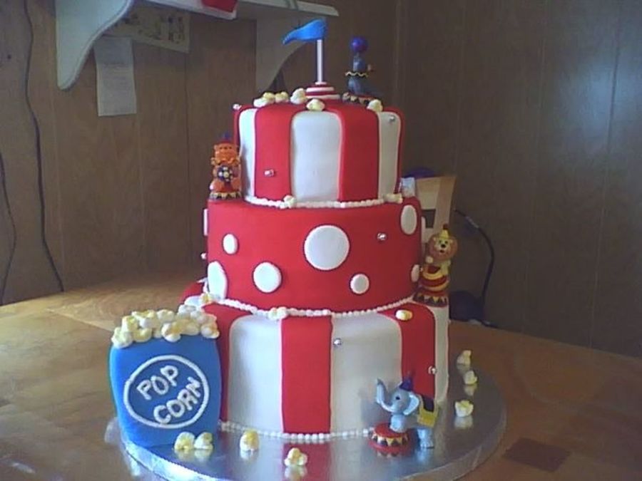 I got the idea for this cake from here. Thanks to the original poster! This is a 6 8 10. Covered in Satin Ice fondant and the wilton circus cake toppers. Popcorn and bag are all fondant.